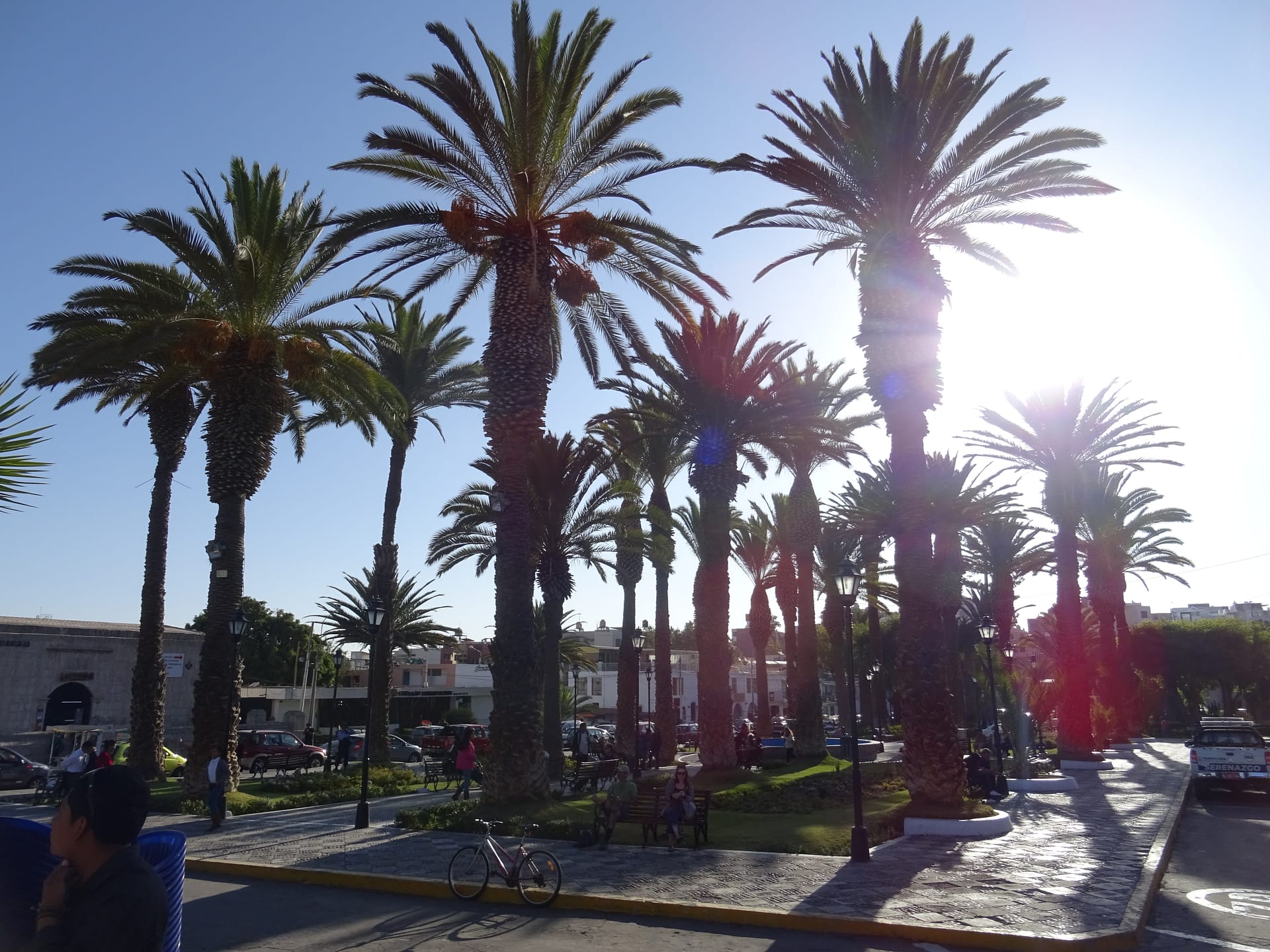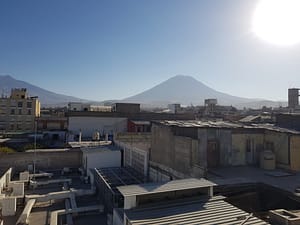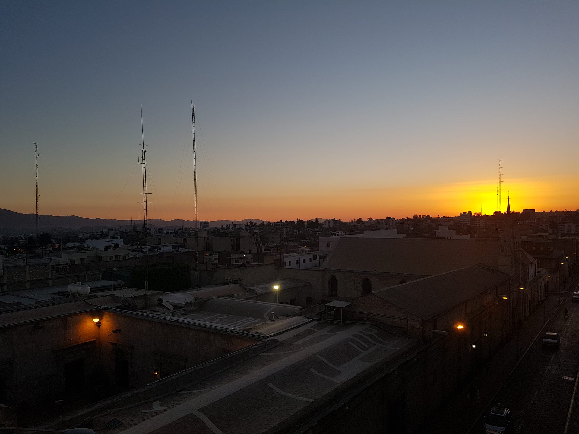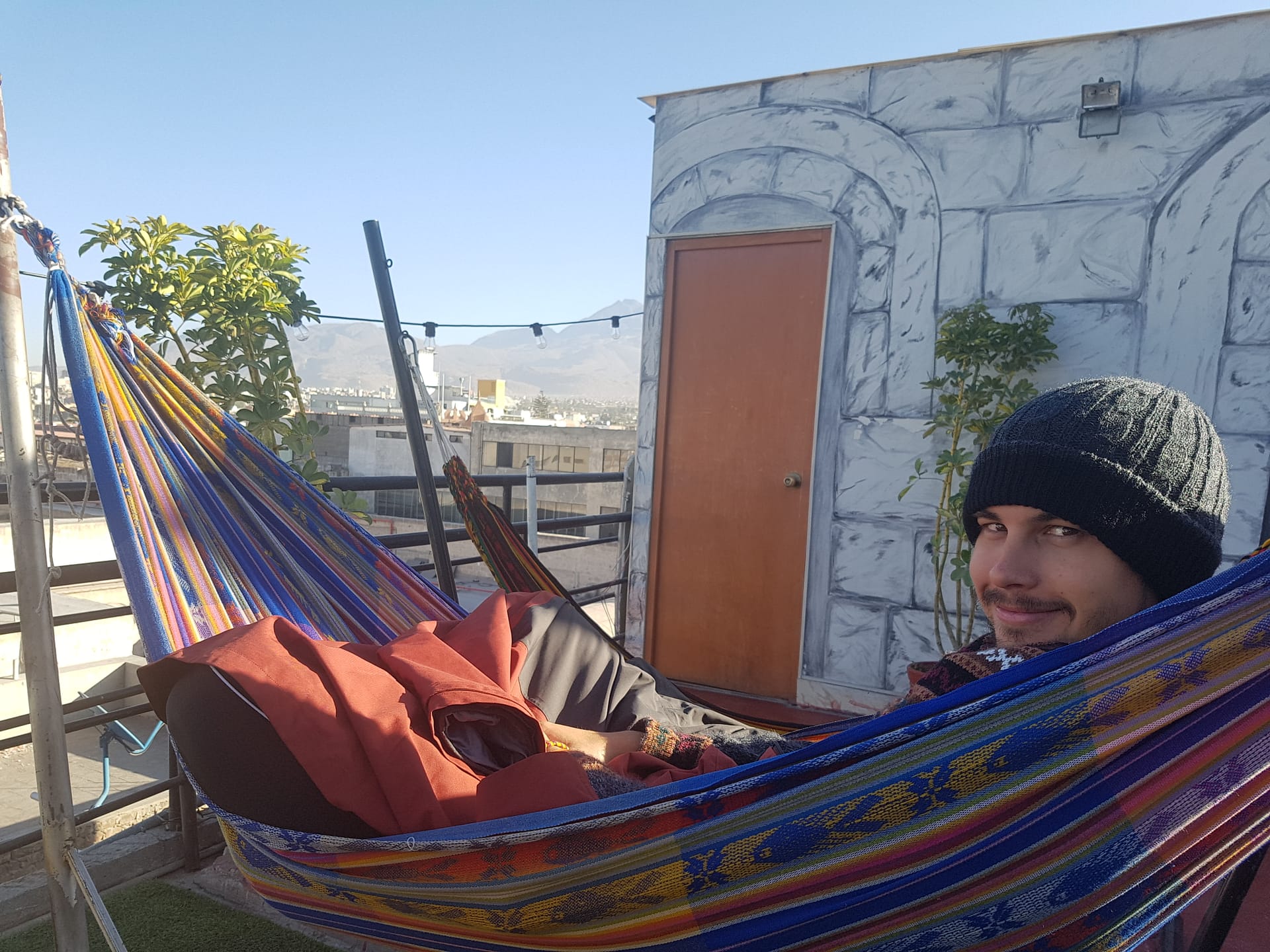 Früh morgens um 06:00 Uhr kommen wir in Arequipa mit dem Nachtbus an. Anschließend geht es kurz mit dem Taxi vom Busterminal zum Plaza de Armes, da unser Hostel in direkter Nähe zum Stadtzentrum liegt. Leider sind wir so früh dran, dass wir noch nicht ins Zimmer können und erstmal 4 Stunden in Hängematten verbringen. Danach dürfen wir dann unser Zimmer (direkt auf der Dachterasse) beziehen und genehmigen uns einen kurzen Mittagsschlaf.