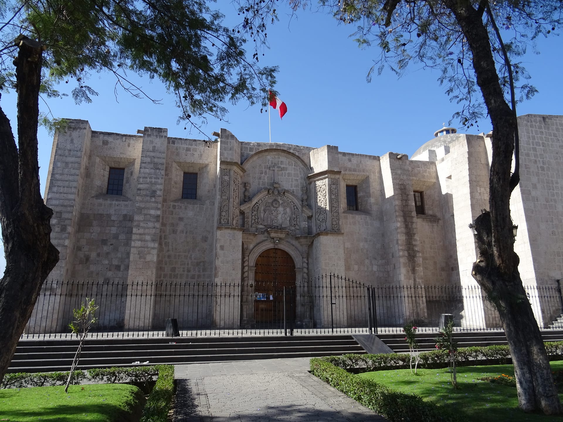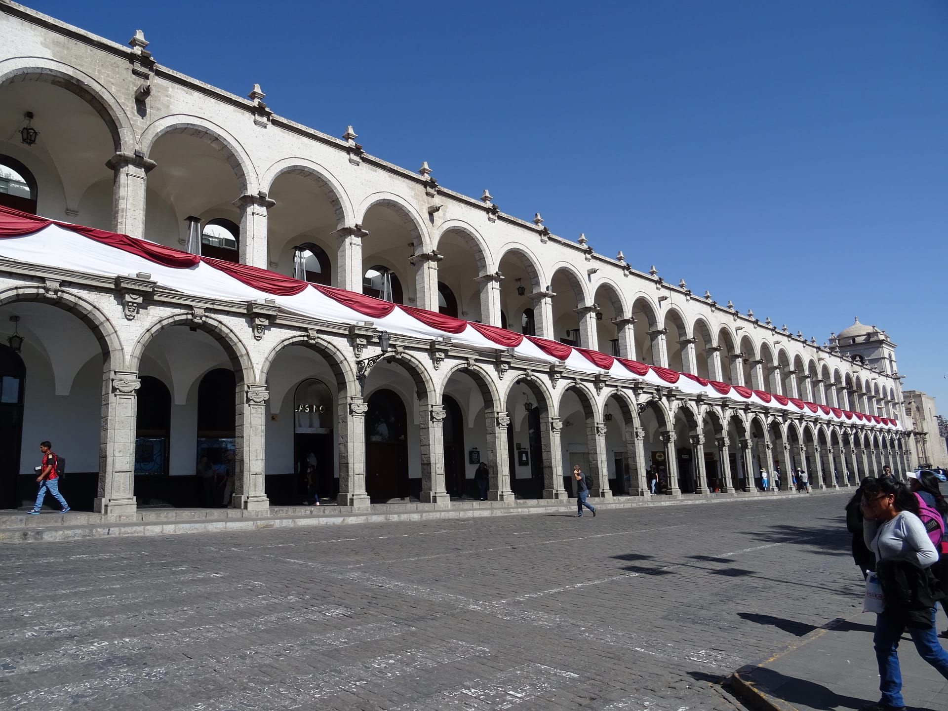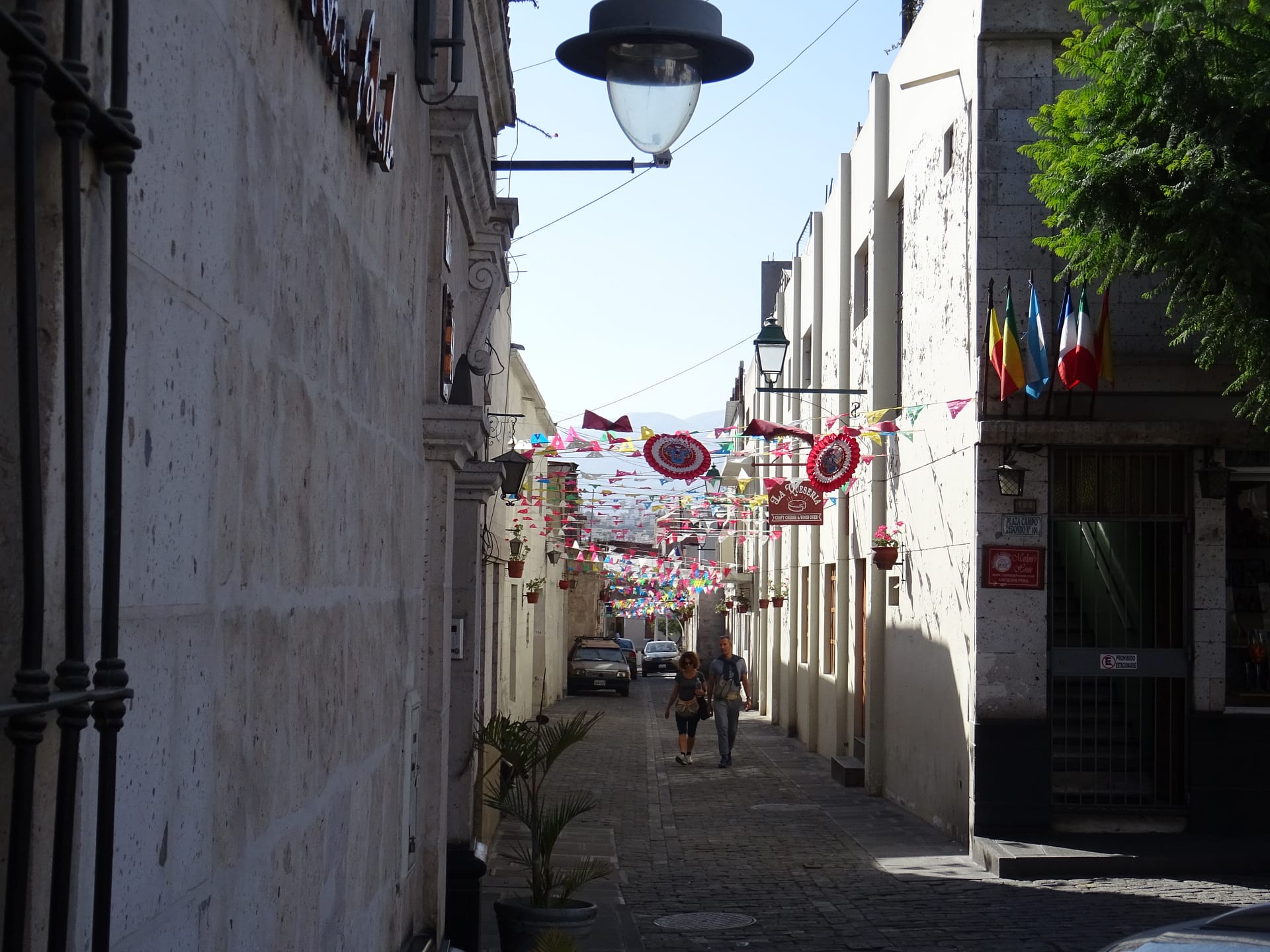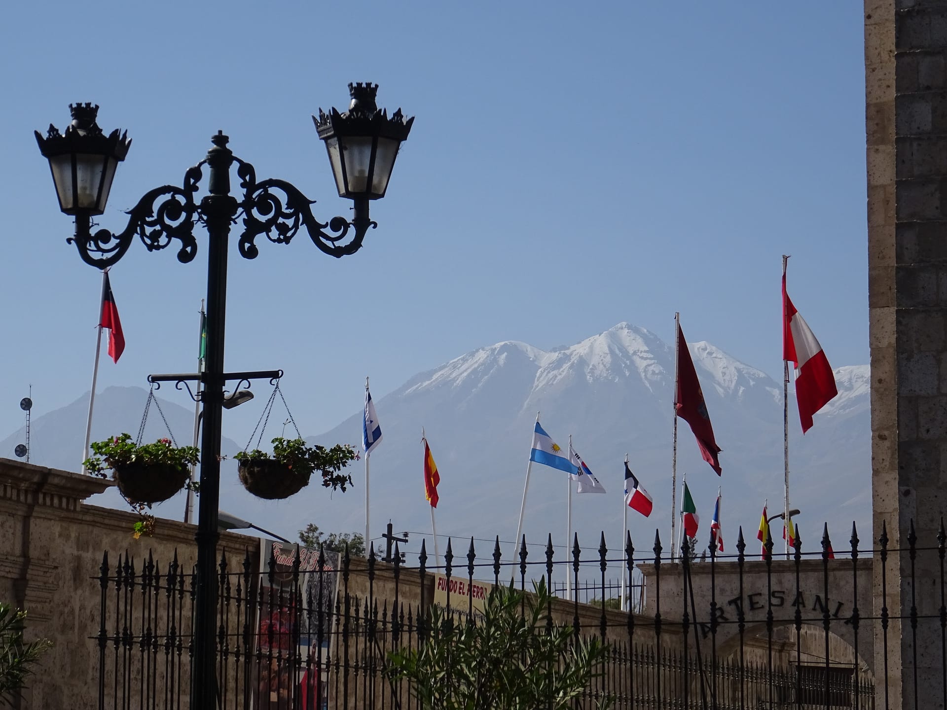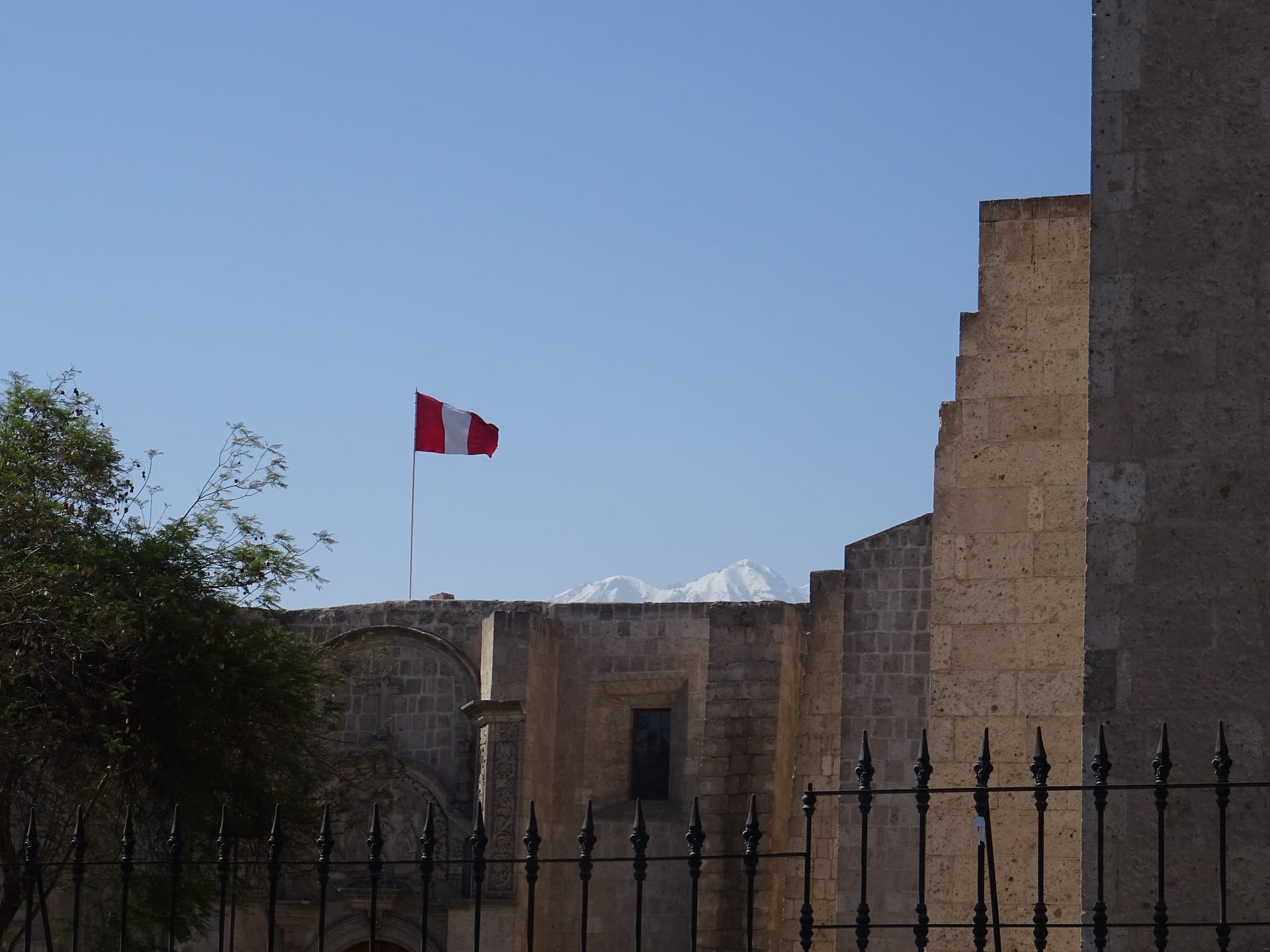 Da es Alinas Fuß leider noch nicht viel besser geht, bleibt sie im Hostel, während ich zu einer Free Walking Tour aufbreche. Wir besichtigen ein paar Straßen, Gebäude und Plätze in der Altstadt bevor es zum neuen Stadtteil in Arequipa geht. Da heute Nationalfeiertag ist, ist der Verkehr auch sehr entspannt und angenehm. Besonders imposant sind die 3 Vulkane, die Arequipa umgeben, da man sie quasi von überall aus sieht und sie zum Teil 3.500m höher sind als die Stadt selbst.