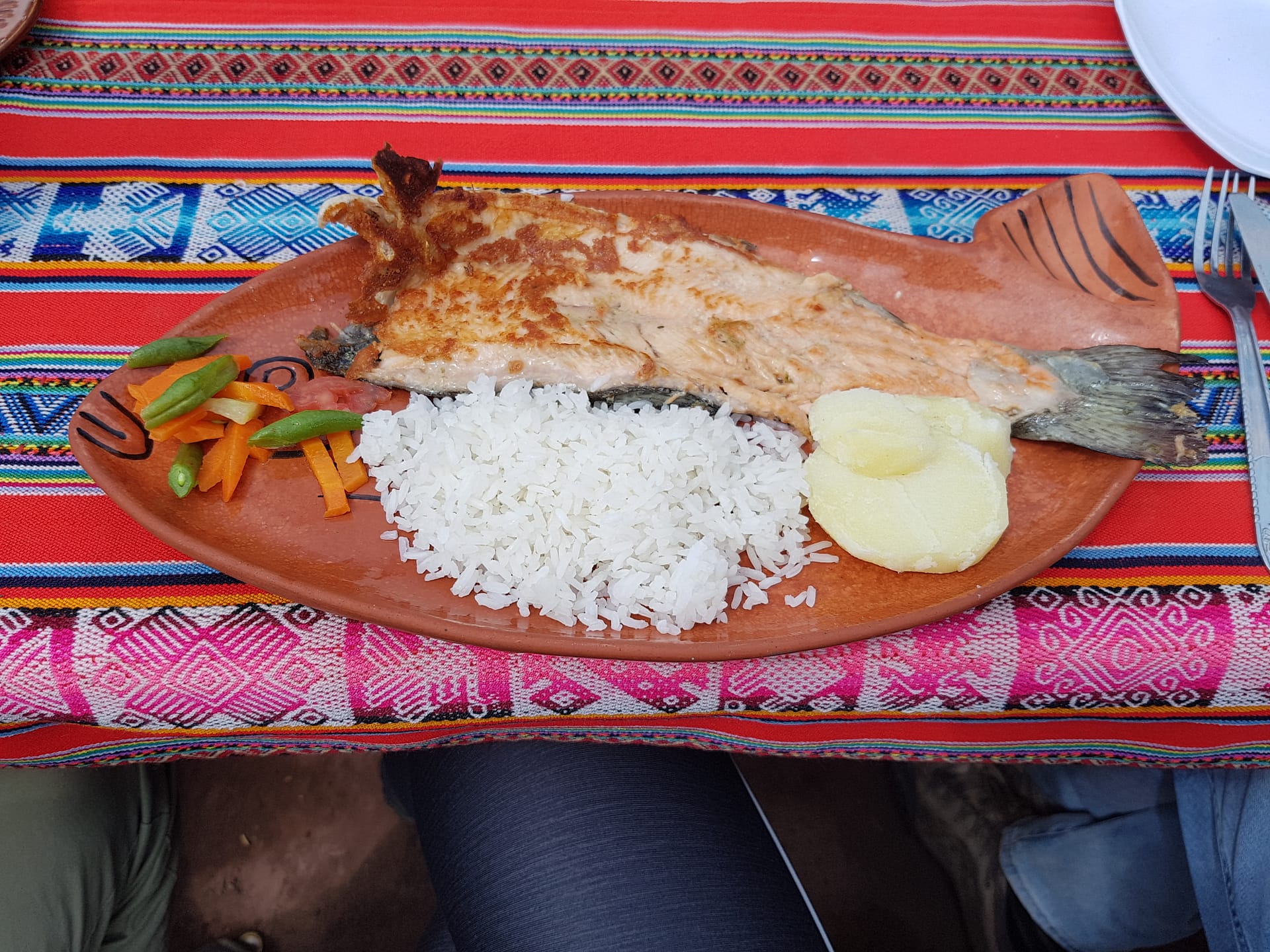 Zum anderen fahren wir danach zur natürlichen Insel Taquile, um dort die Ruinen aus Vor-Inka Zeiten zu besichtigen und ein sehr leckeres Mittagessen (Forelle aus dem Titicacasee) zu genießen. Der Weg hoch zum Restaurant besteht aus 200 Streppenstufen, was uns auf uns knapp 4.000m schon sehr die Luft raubt. Oben angekommen, haben wir einen wunderbaren Blick auf den Titicacasee, der entgegen unserer Erwartungen glasklares Wasser führt (zumindest an dieser Stelle). Vorbei an den Ruinen kommen wir nach ca. 30 min. Fußmarsch an dem Restaurant an.