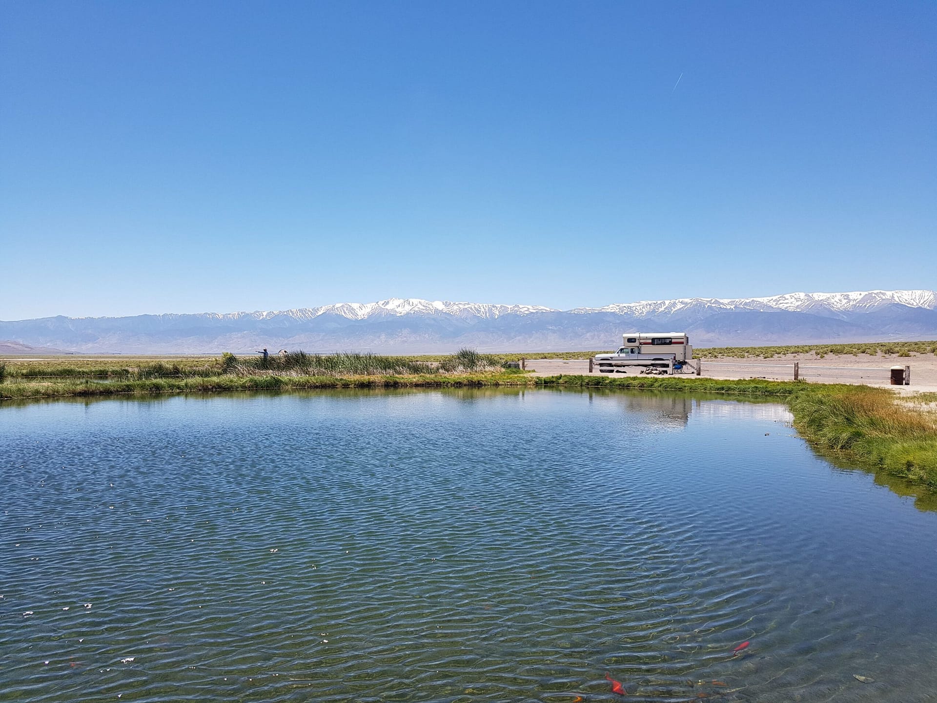 Nachdem wir alles wieder aufgeräumt und die Patronenhülsen eingesammelt haben, ist unser letzter Stopp bei einer heißen Quelle mit kleinem Pool und riesigen ausgesetzten Goldfischen und Fröschen.