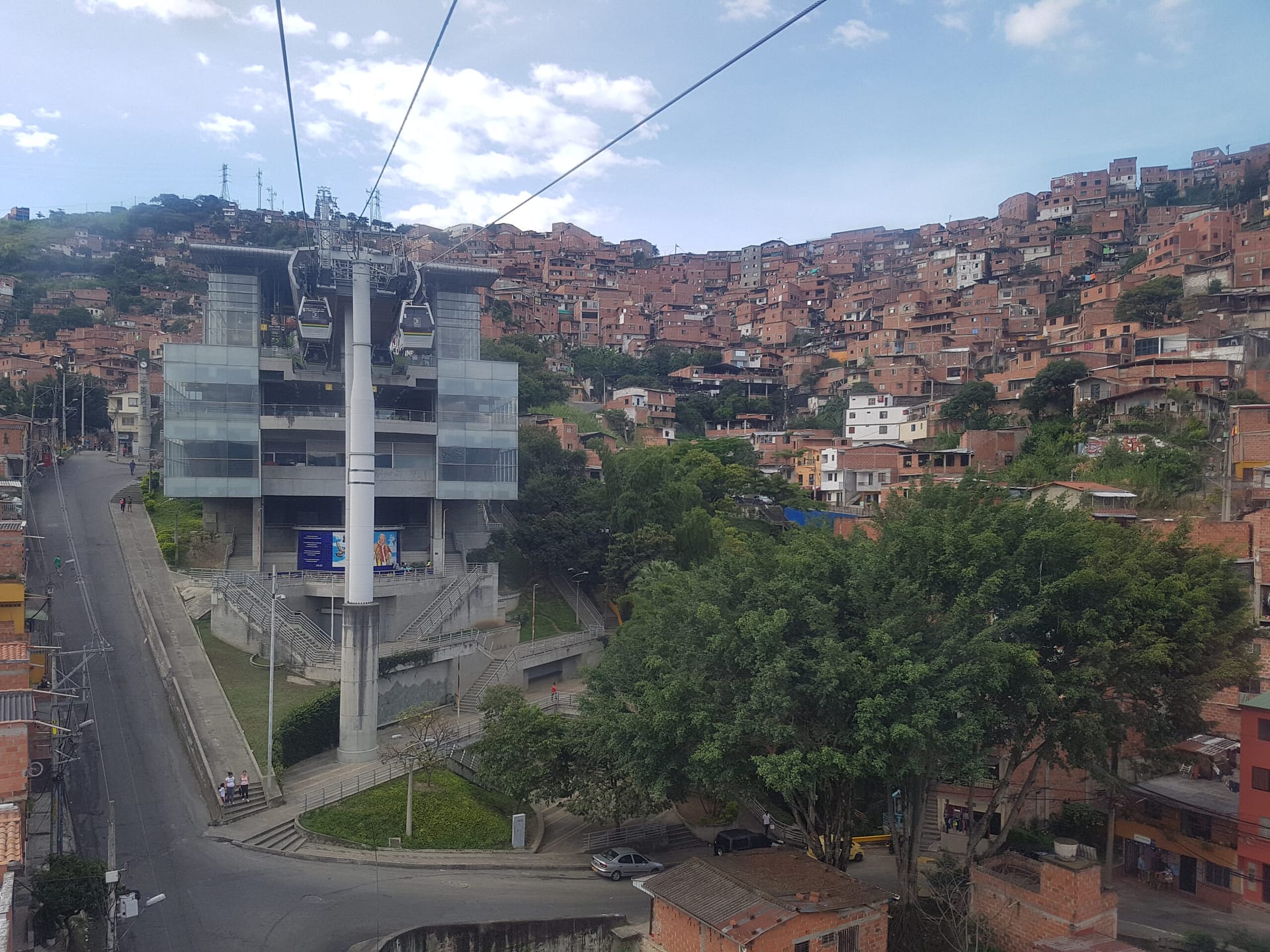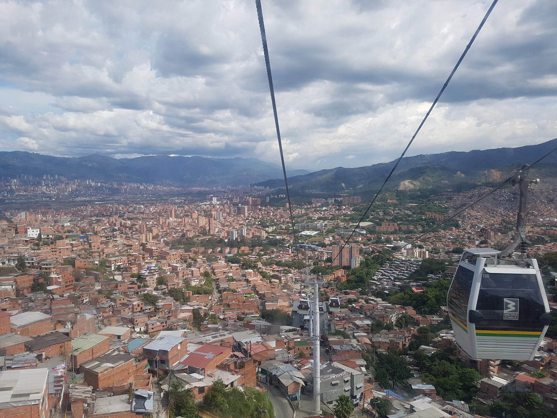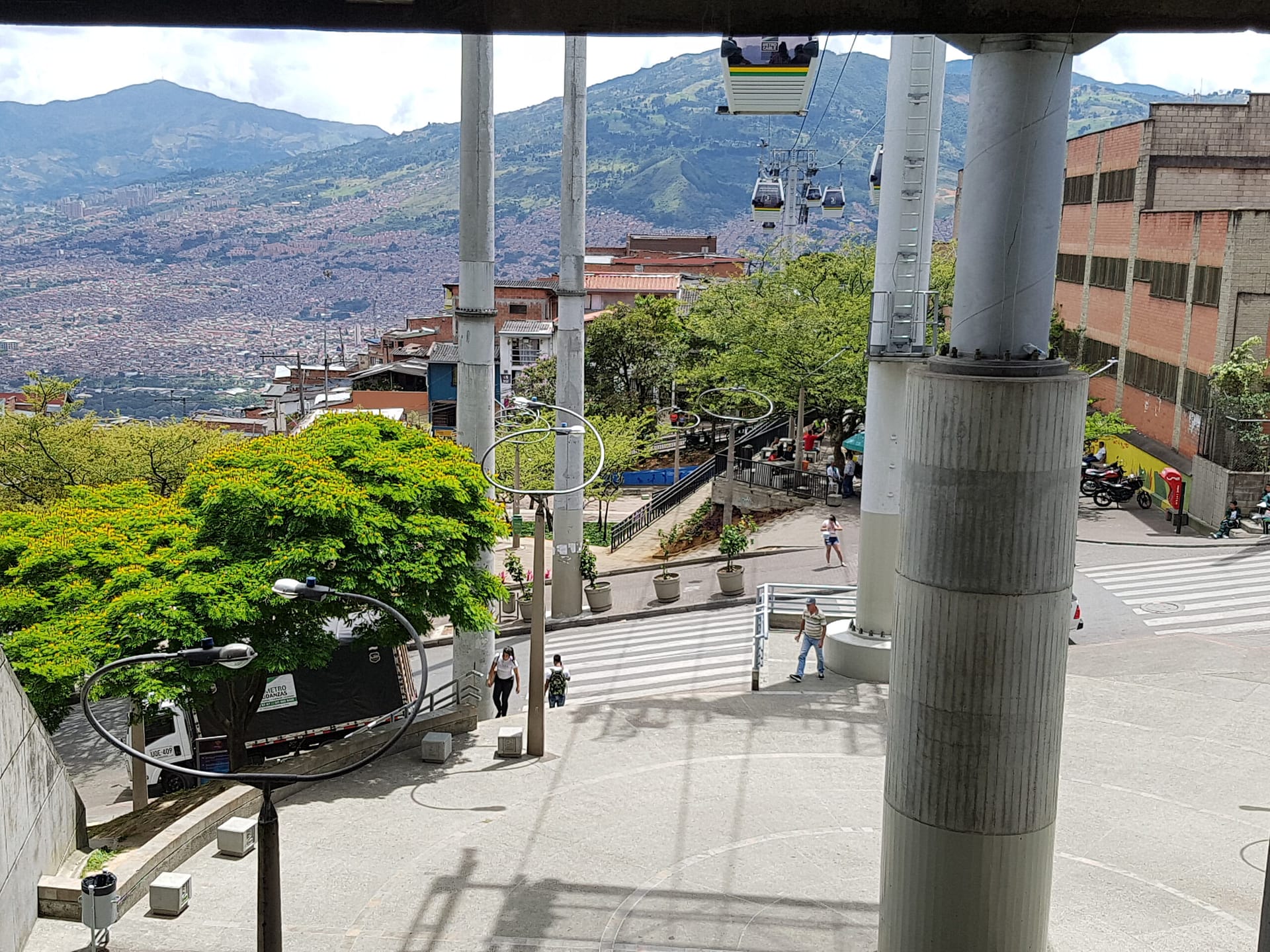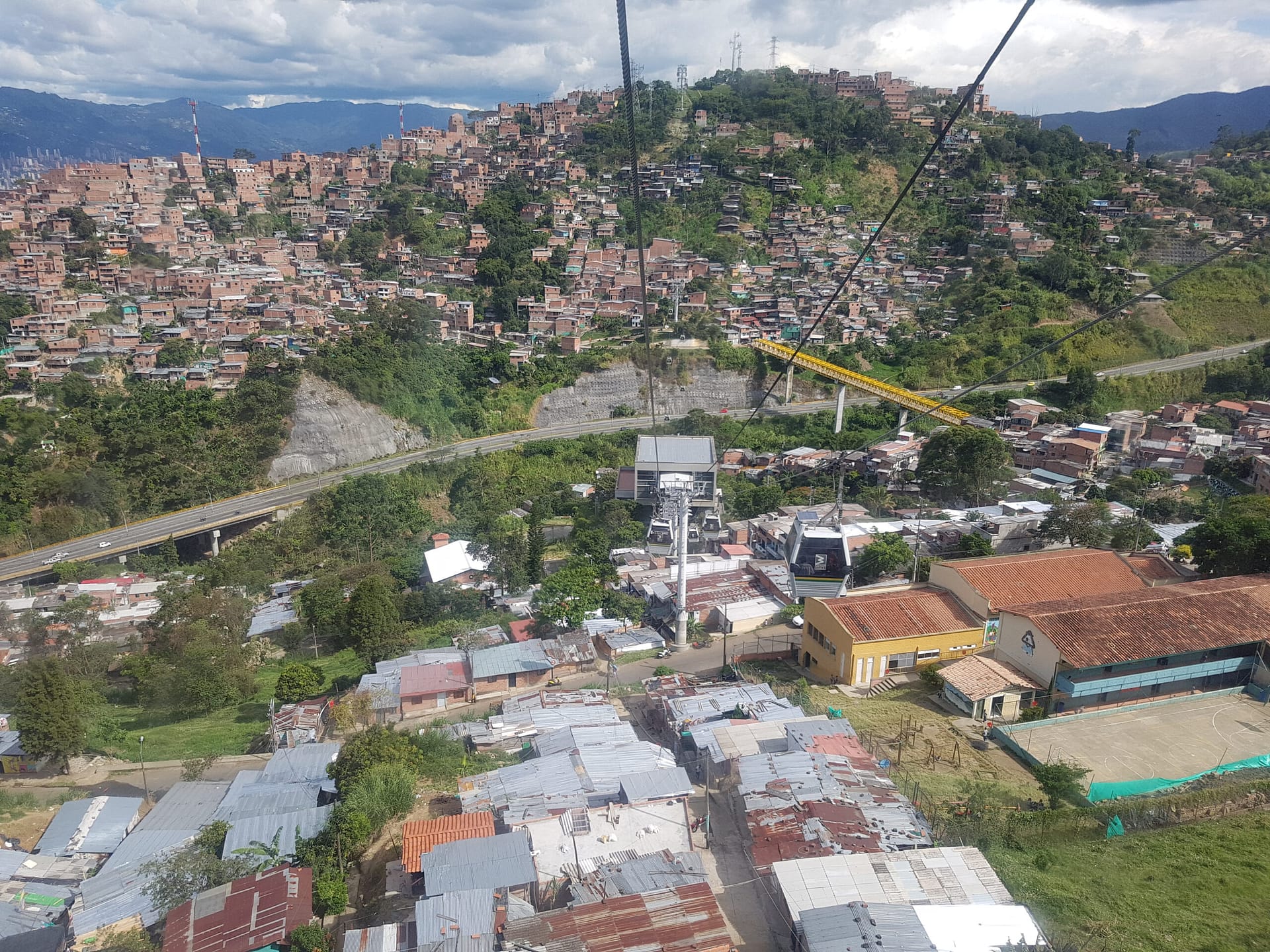 Auf jeden Fall entschließen wir uns deswegen heute etwas langsamer zu machen. Nach einem geilen Frühstück mit Rührei, frischer Mango sowie Ananas nehmen wir die Metro, um ans andere Ende der Stadt zu fahren und unser erstes Cable Car zu nehmen. Es geht über die ärmsten Bezirke Medellíns hinweg auf einen Berg mit tollem Blick auf die Stadt. Für umgerechnet 60 Cent kann man den ganzen Tag Metro und Cable Car fahren, wenn man das Metrosystem nicht verlässt.