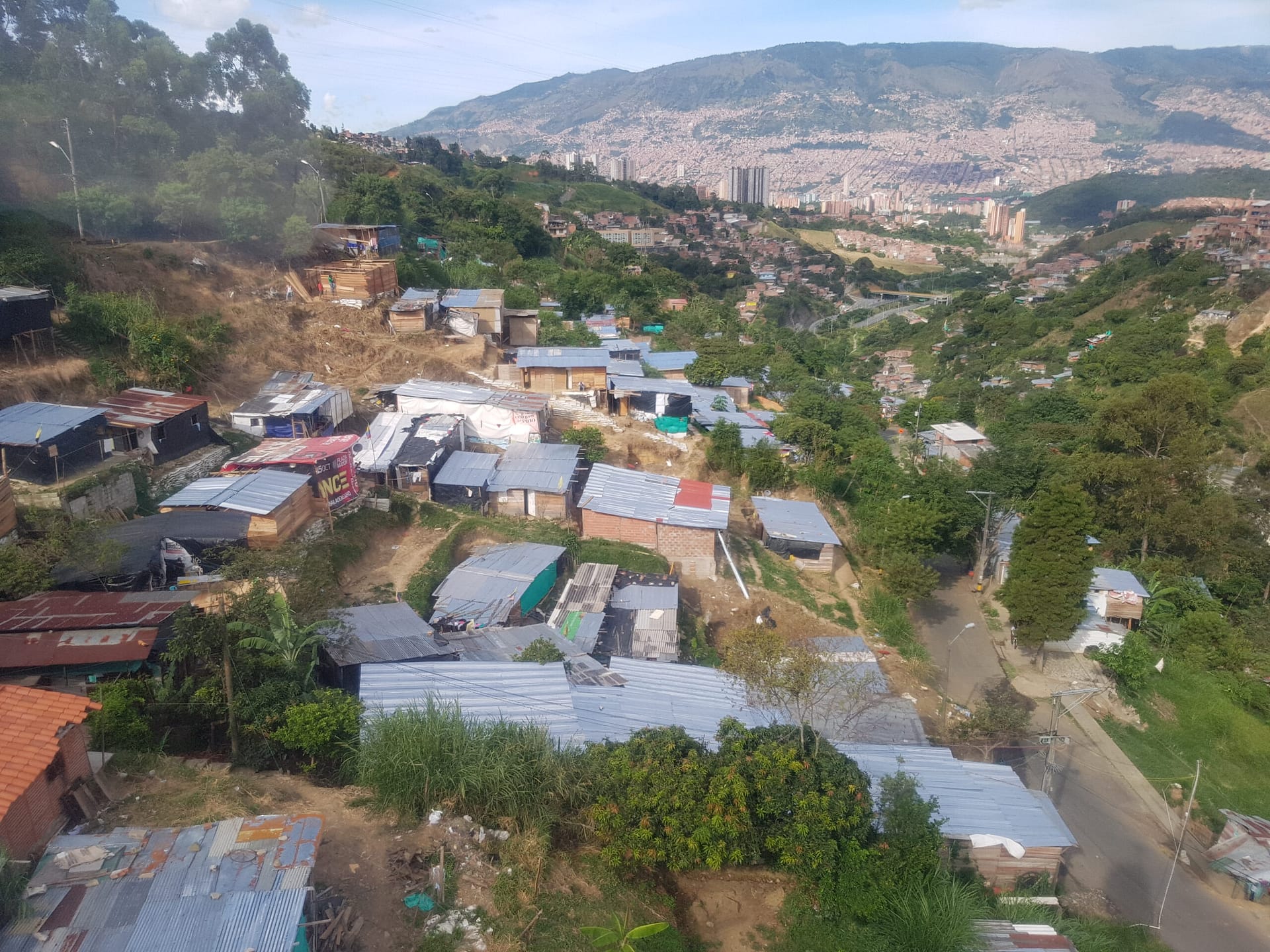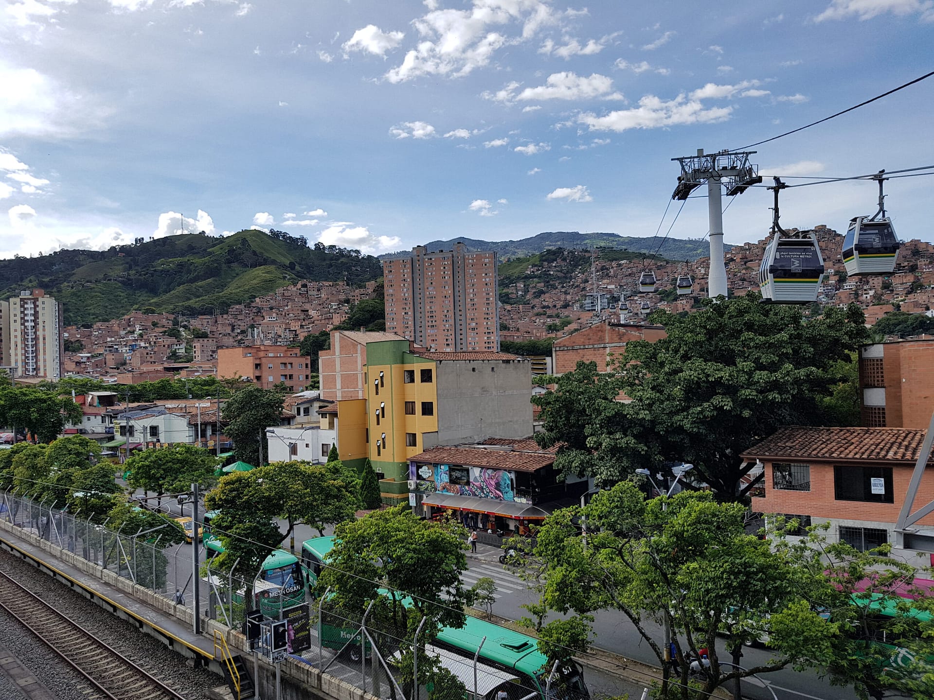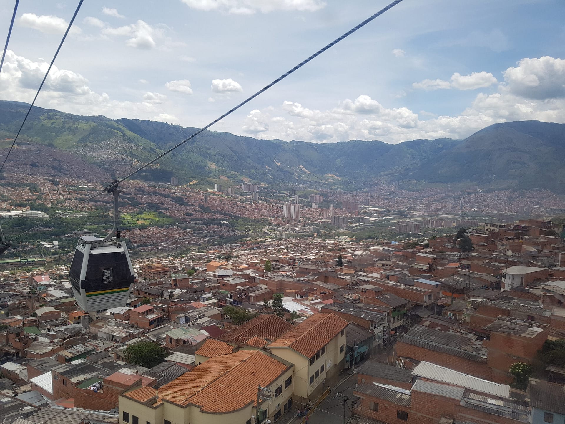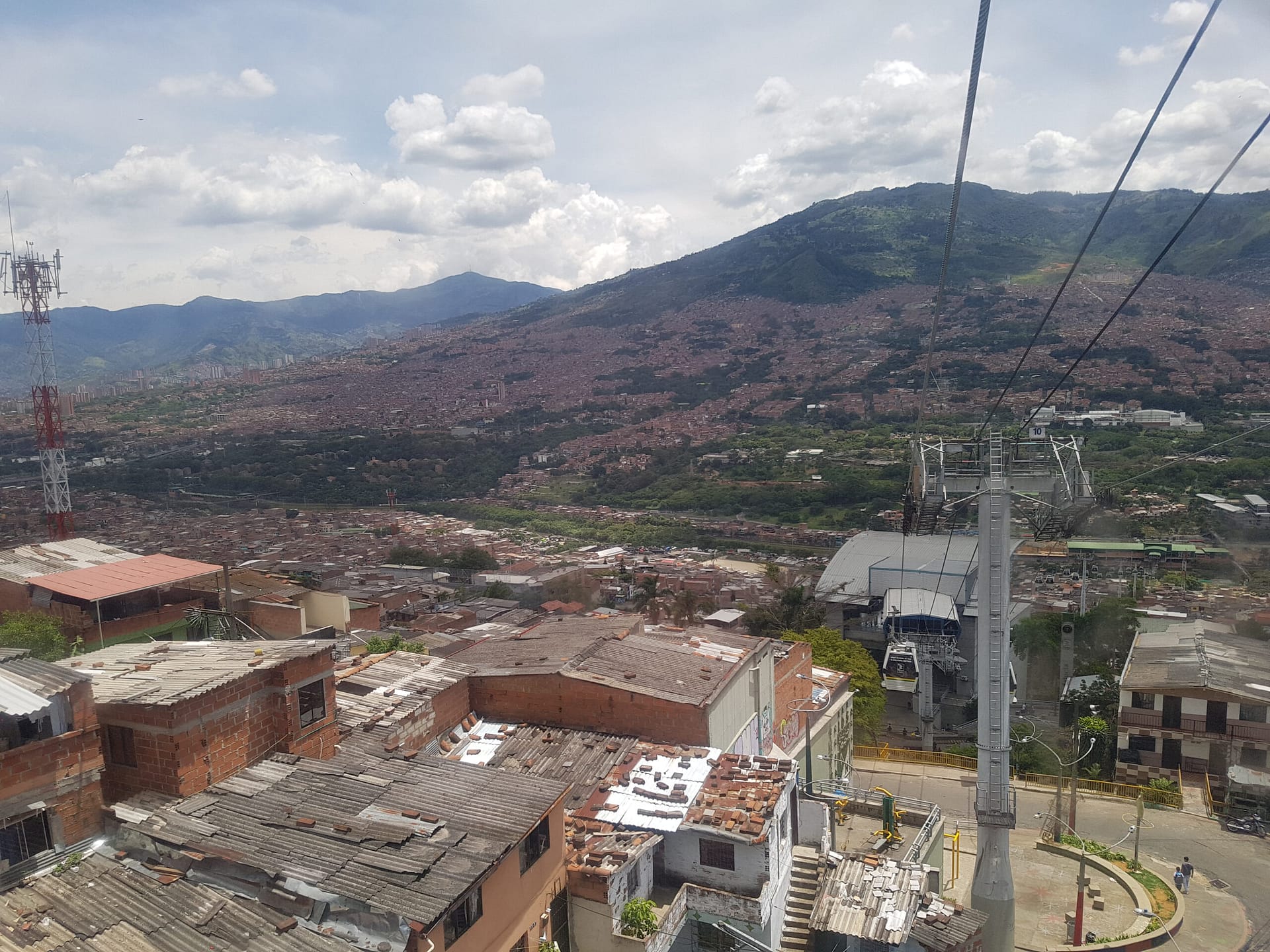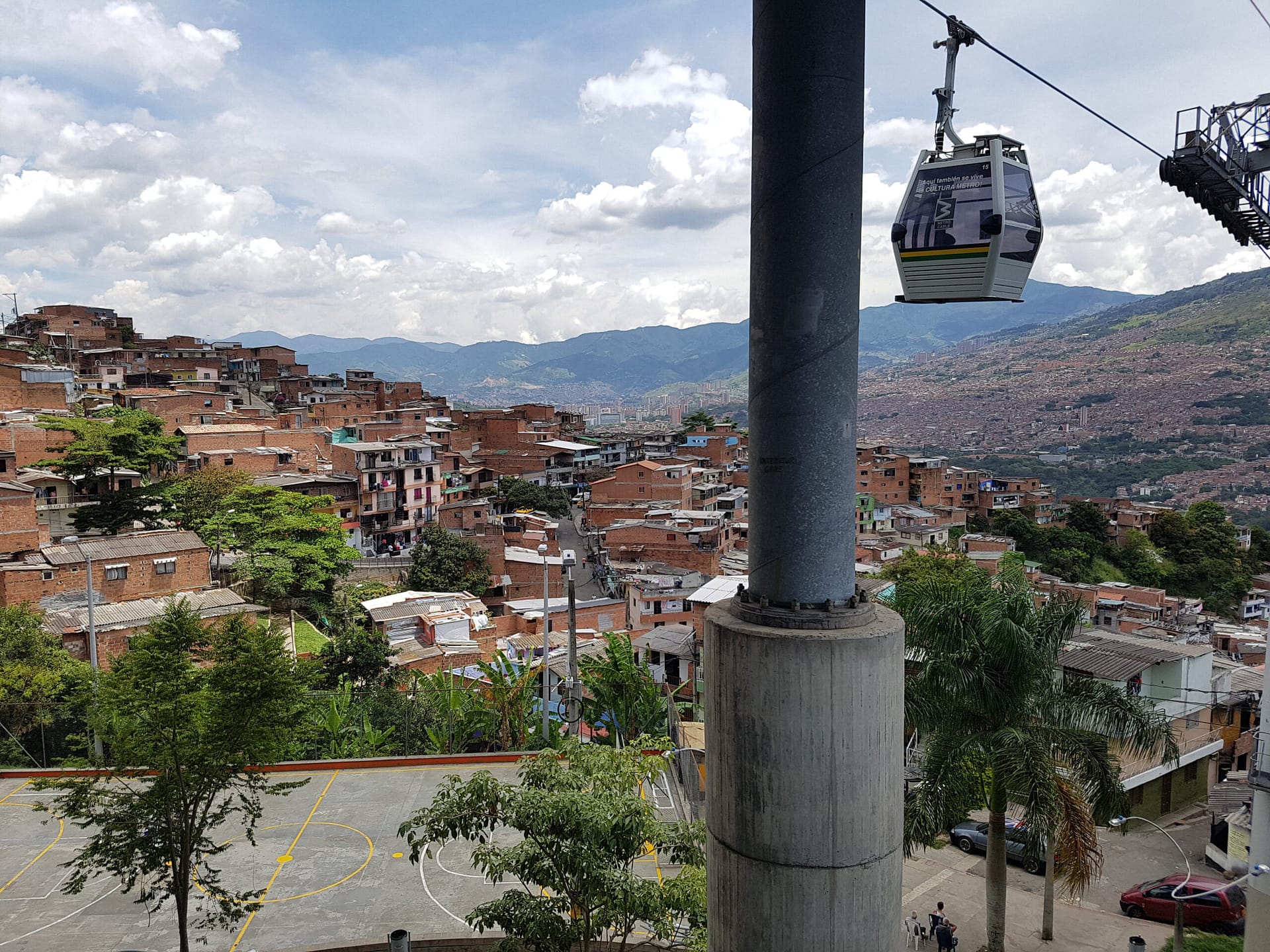 Auf jeden Fall entschließen wir uns deswegen heute etwas langsamer zu machen. Nach einem geilen Frühstück mit Rührei, frischer Mango sowie Ananas nehmen wir die Metro, um ans andere Ende der Stadt zu fahren und unser erstes Cable Car zu nehmen. Es geht über die ärmsten Bezirke Medellíns hinweg auf einen Berg mit tollem Blick auf die Stadt. Für umgerechnet 60 Cent kann man den ganzen Tag Metro und Cable Car fahren, wenn man das Metrosystem nicht verlässt.