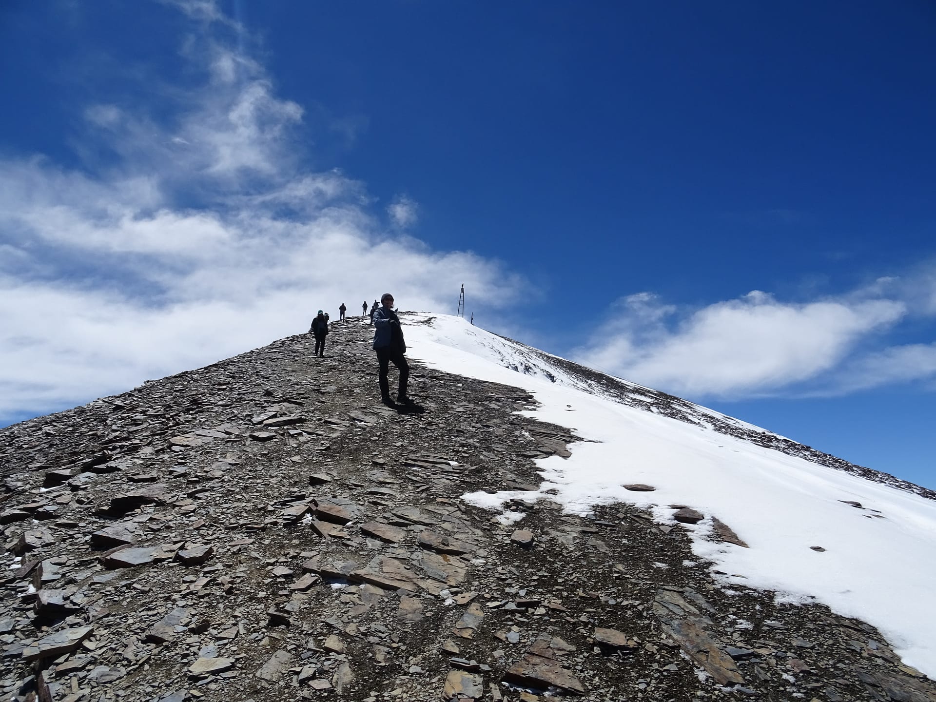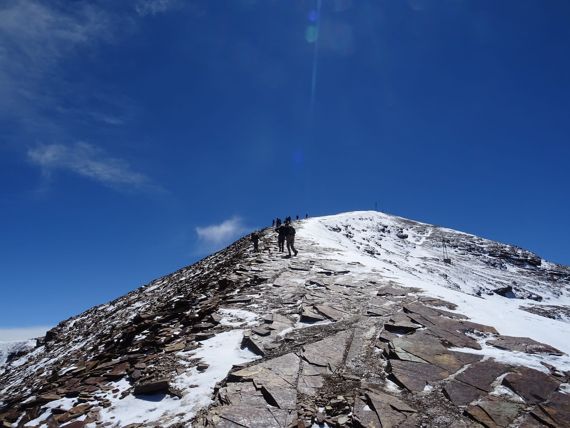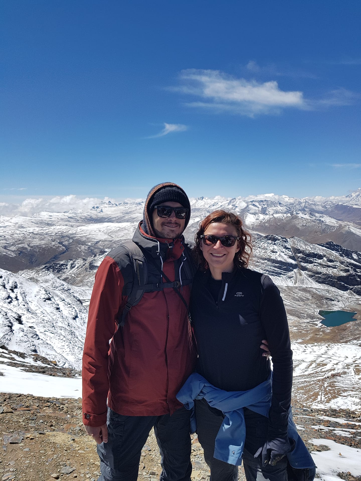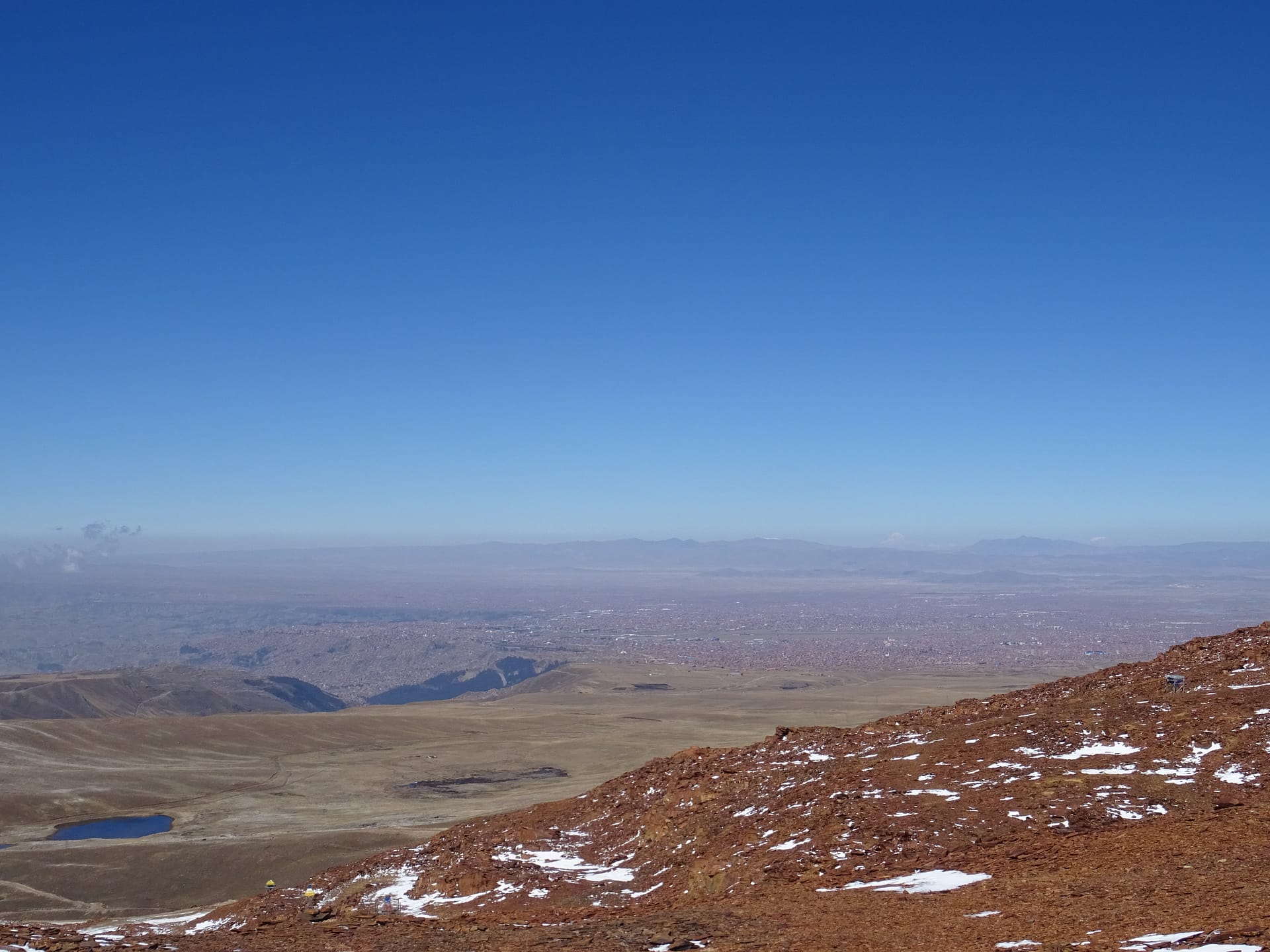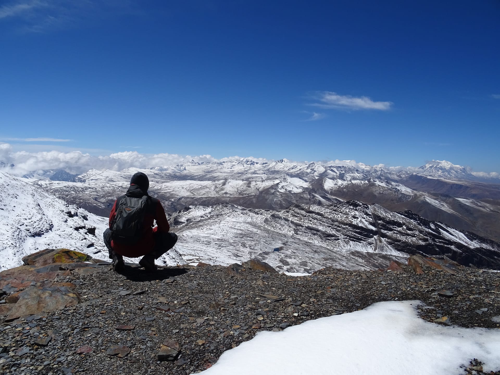 Nach langem, kraftraubendem und kaltem Aufstieg, haben wir es geschafft und unseren bislang höchsten Berg erklommen. Die Aussicht von 5.395m ist atemberaubend. Man sieht La Paz, den Titicacasee und sogar den entfernten höchsten Vulkan in Bolivien – traumhaftes Wetter!